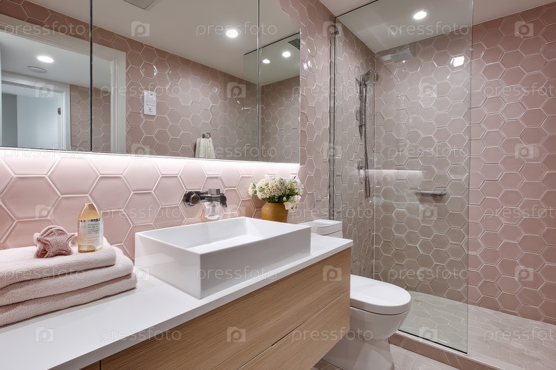 Элегантная и современная ванная комната с красивыми розовыми шестиугольными плитками для шикарного вида