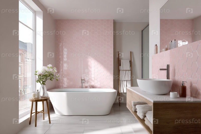 Эта стильная ванная комната может похвастаться розовой плиткой, современной раковиной и элегантным декором, добавляя очарование и характер