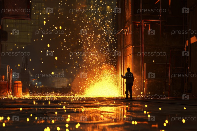 Силуэт рабочего стоит на фоне интенсивного огня и искр в промышленной обстановке