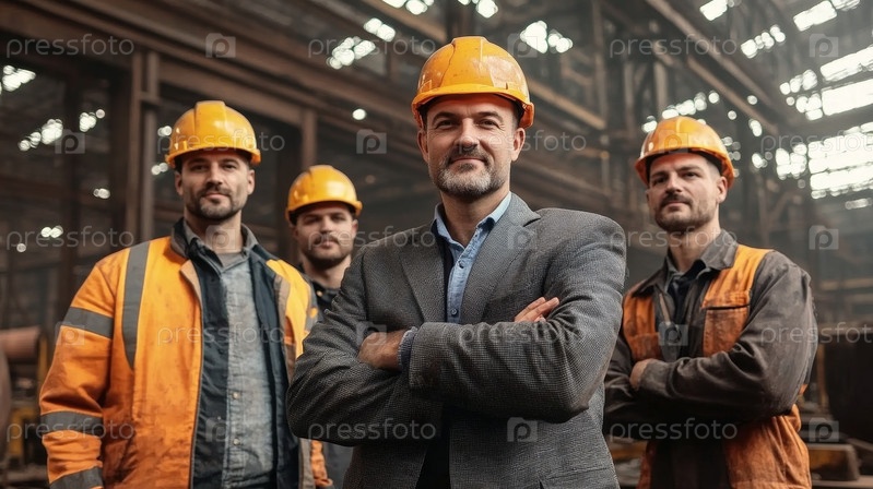 Специальная строительная команда с защитным снаряжением активно работает на оживленном заводе по производству стали