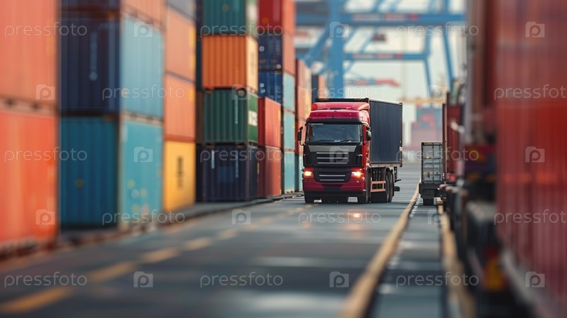 Ярко-красный грузовик умело перемещается по судоходным путям в шумном порту, заполненном красочными контейнерами