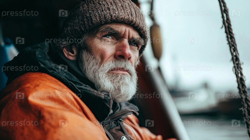 Прочный, решительный человек в ярко-оранжевой куртке мужественно сталкивается с ледяными бурными океанскими бурями с решительным характером