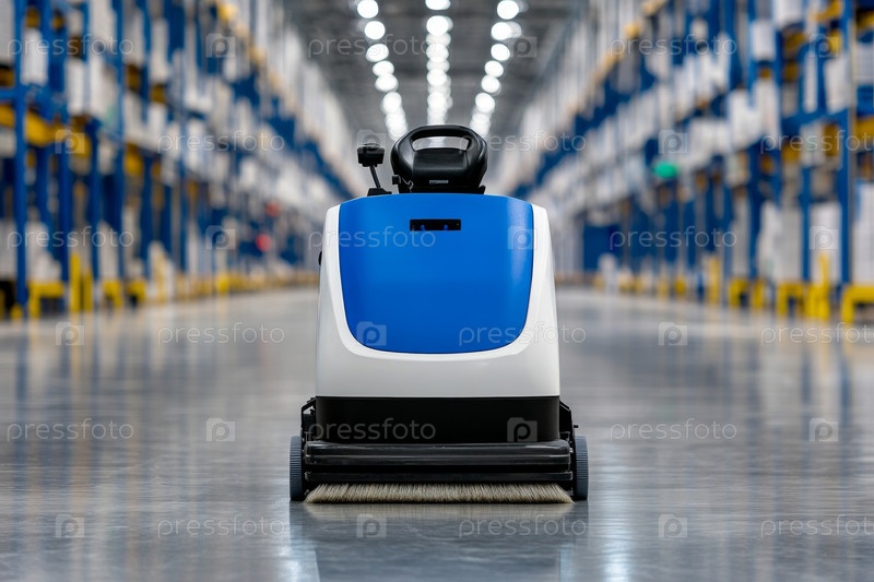 В промышленной складской установке есть компактный пол скруббер, используемый для поддержания чистоты