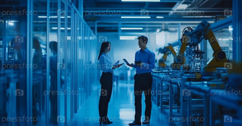 Два инженера в исследовательской лаборатории робототехники, разнообразная команда, проходящая через мастерскую с тусклым синим светом, осматривая прототип роботизированной руки, планшет в руке, обсуждая