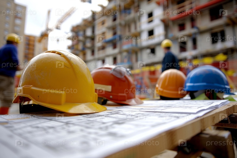Строительный шлем и чертежи на столе, в фоновом режиме рабочие обсуждают на строительной площадке,