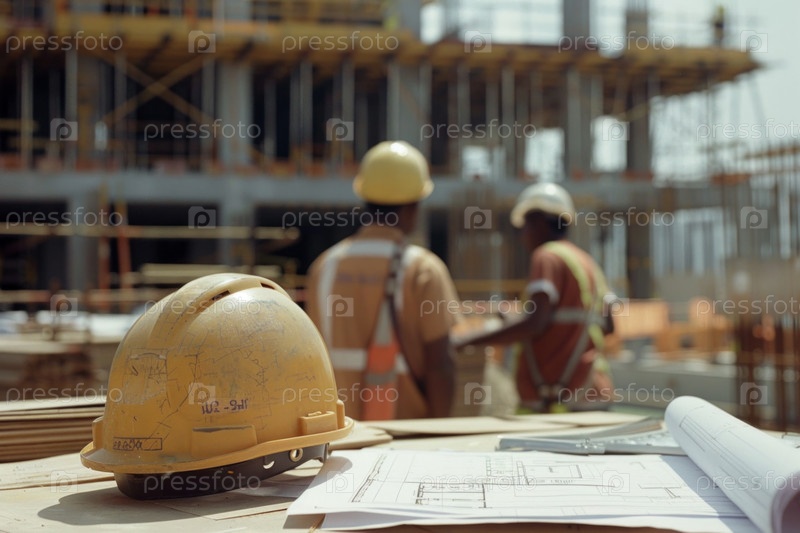 Строительный шлем и чертежи на столе, в фоновом режиме рабочие обсуждают на строительной площадке,