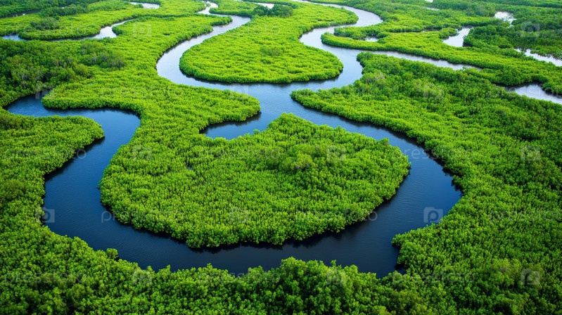 Вид с воздуха, захватывающий блуждающую реку, которая проходит через пышный зеленый тропический лес в великолепии природы