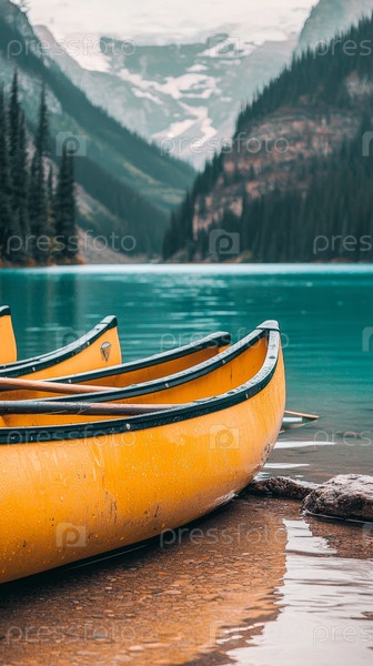 Безмятежная и спокойная сцена озера с яркими красными каноэ на фоне захватывающих снежных гор