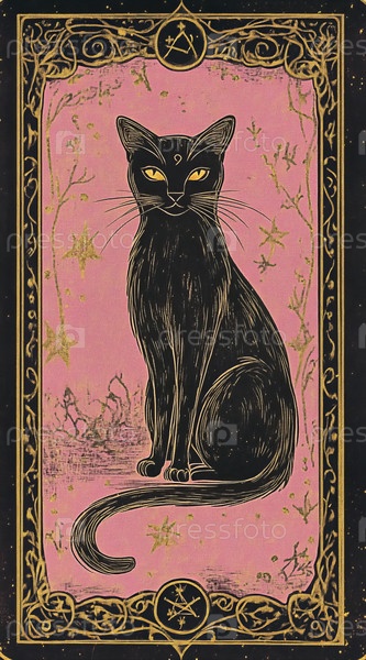 Очаровательная карта таро черной кошки с замысловатыми золотыми деталями, идеально подходящая для мистики и астрологии