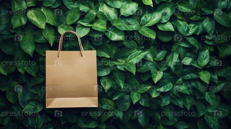 Полный макет многоразового бумажного пакета для покупок на фоне зеленых листьев