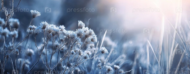 Красивый морозный утренний сияние освещает нежные цветы в поле