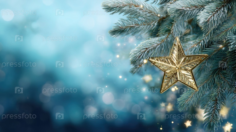 Рождественские ветви елки обрамляют золотой звездой на размытом синем фоне. Рождество и зимнее время
