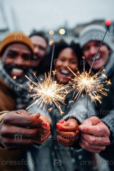 Радостное празднование свечей, Друзья веселые со светящимися искрами во время вечерних праздников, искренний момент улыбки друзей и веселья с искрами на открытом воздухе