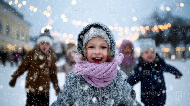 Праздничная снежная лихорадка, Дети хихикают во время зимних праздников, Дети наслаждаются яркой праздничной сценой, Веселые дети смеются, когда снег выпадает во время зимнего празднования
