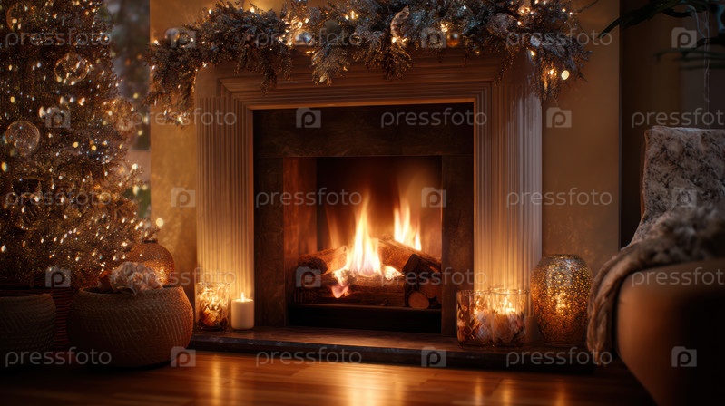 Праздничная уютная сцена в помещении, приглашение зимней вечерней атмосферы с сезонными украшениями, очаровательное праздничное жилое пространство с утешительными элементами и нежным освещением