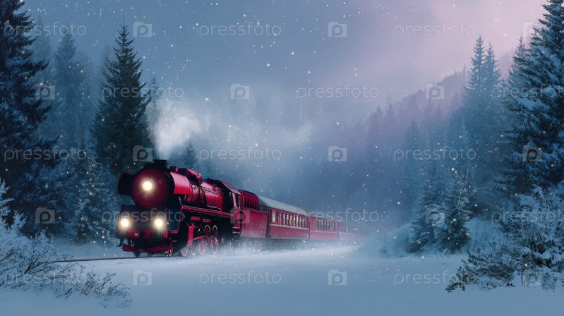 Приключение паровоза, классический красный паровой двигатель, движущийся в зимнем ландшафте, старомодный поезд, дрожащий в снежном лесу под синей зимой