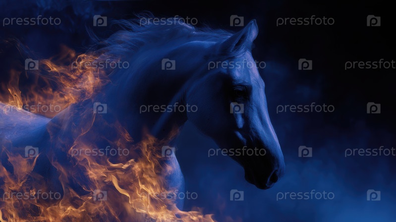 Сияющий огненный конь скачет ночью по заполненному дымом парку с фиолетовыми светодиодными созвездиями на теле, пылающей гривой, тянущейся за угли, деревьями, украшенными феей