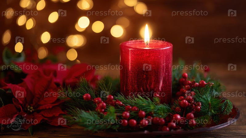 Теплая сцена украшения праздничных свечей, Уютное праздничное расположение со свечами и ягодами, Сезонная установка свечей, создающая приглашающее тепло с ягодами и мягким освещением