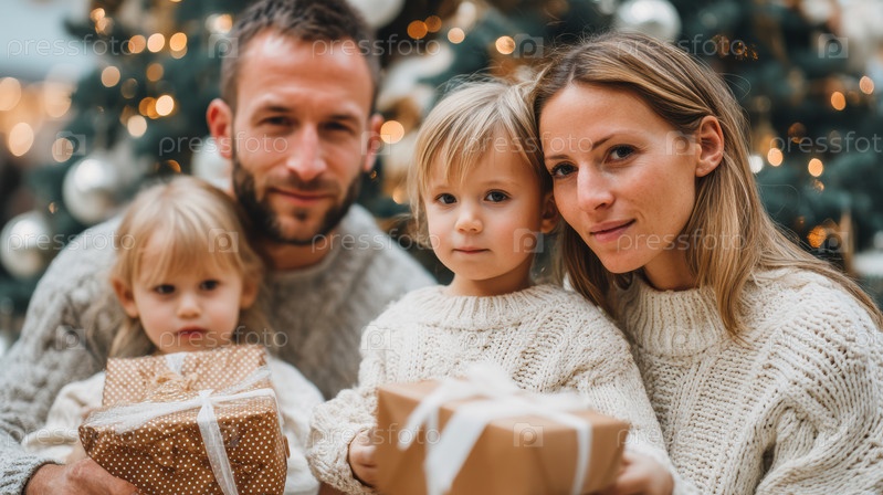Теплый семейный портрет под украшенным деревом с улыбающимися детьми и родителями, уютный праздничный образ, демонстрирующий родителей и детей, разделяющих подарки и нежные улыбки в помещении
