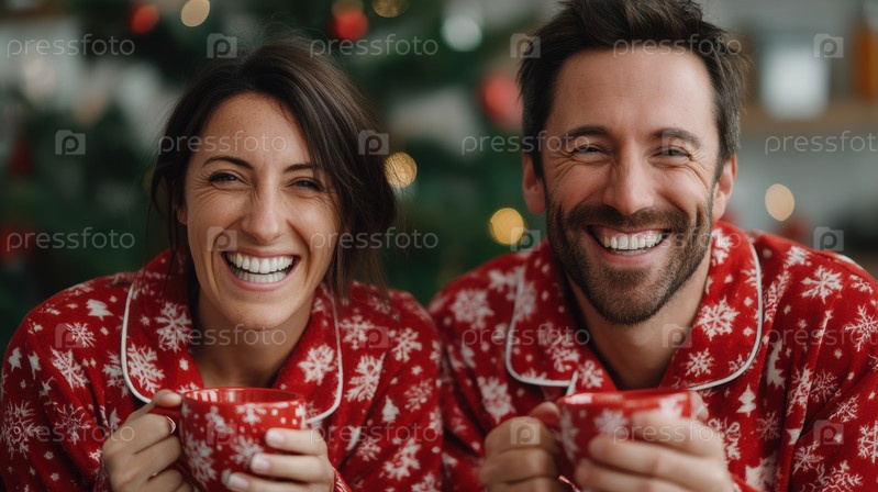 Уютная кавказская пара в пижаме, потягивающая горячее какао на мягком одеяле рядом с украшенным рождественским деревом с теплыми огнями боке, улыбаясь и делясь нежными