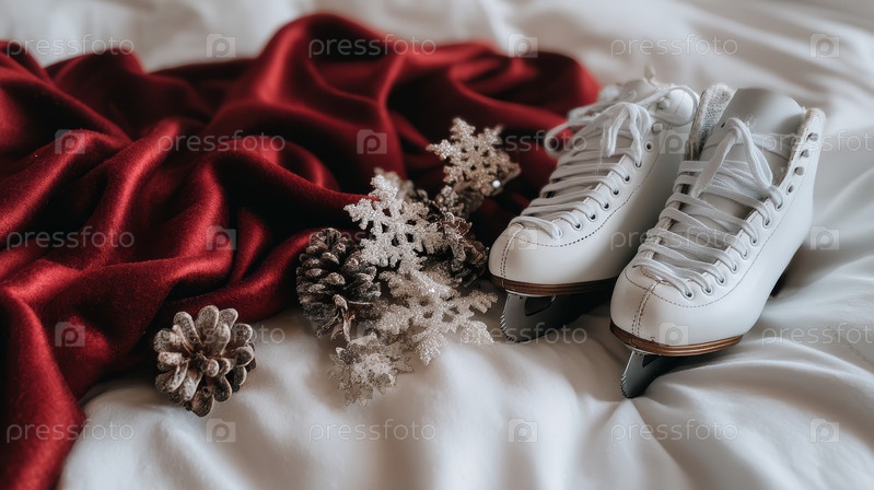 Белые кожаные коньки рядом с бордовым шарфом, расположенным на текстурном бетоне с трикотажным свитером, соснами, искусственным снегом и теплым деревенским освещением; подготовка стилиста