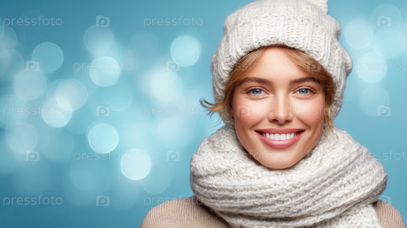 Улыбающаяся женщина на открытом воздухе в трикотаже, яркий зимний портрет с падающими хлопьями, мягкое боке снежных деревьев, уютный шарф и беани, естественный свет, теплый подлинный