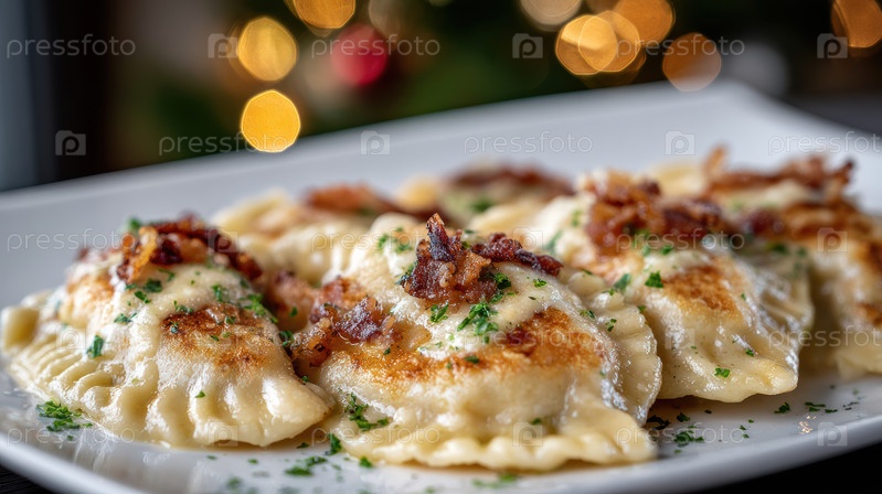 Праздничный стол с золотыми пельменями, расплавленным сыром и травяным маслом, хрустальными стеклами и боке при свечах, создающим теплую атмосферу праздника, петрушка