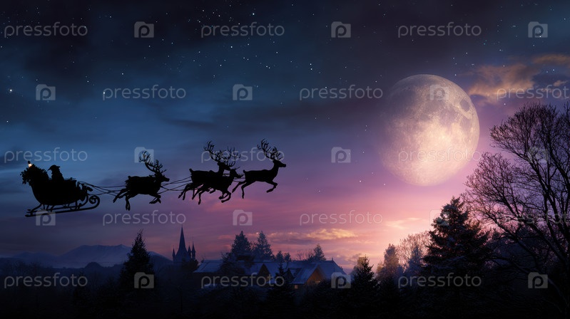 Ночное путешествие в отпуск со светящимися огнями, Санта в украшенных санях, пролетающих мимо силуэтных деревьев, Кинематографическая зимняя ночь с Санта и оленями рядом с уютным домом