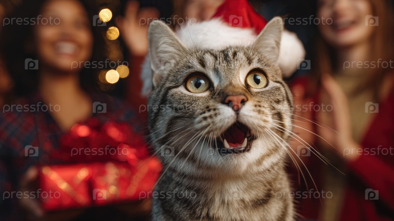 Удивленный табби-кошка в шляпе Санта, мяуканье в передней и центральной части во время уютной праздничной вечеринки, размытые улыбающиеся гости на заднем плане, теплые боке огни, завернутые