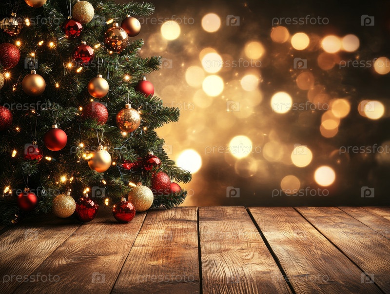 Празднично украшенный Рождественская елка над деревянным столом; пышные зеленые ветви, отделанные красными и золотыми пузырьками и теплыми струнными огнями, текстурированная стена из тила