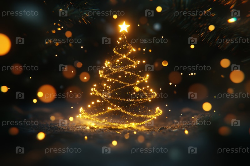 Крошечный освещенный Рождественская елка на снегу, окруженная золотистым боке и падающими хлопьями; теплое янтарное свечение отражается на ледяной поверхности, неглубокая глубина создает мечтательные,