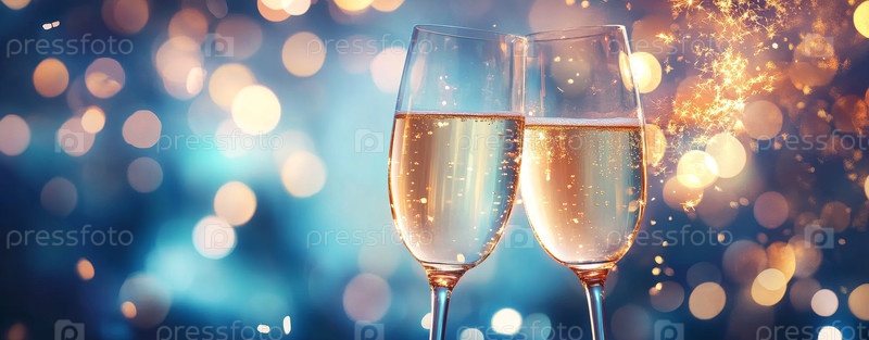 Новый год - празднование тостов шампанского - кубки с золотым блеском на синем