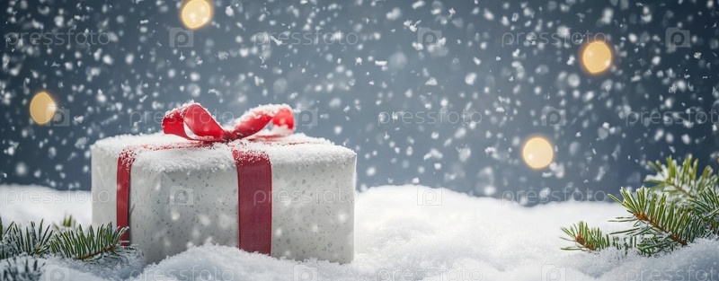 Красивая красная подарочная коробка, украшенная лентой, покоится на снегу с сверкающими огнями на заднем плане