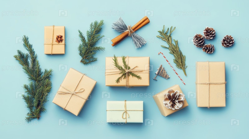Крафт завернул подарки на пастельный синий фон с сосновыми ветками, соснами и конфетными тростями, демонстрируя устойчивую подарочную обертку и подготовку заказов для малого бизнеса;