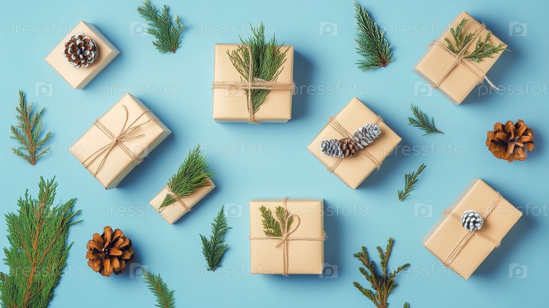 Крафт завернул подарки на пастельный синий фон с сосновыми ветками, соснами и конфетными тростями, демонстрируя устойчивую подарочную обертку и подготовку заказов для малого бизнеса;