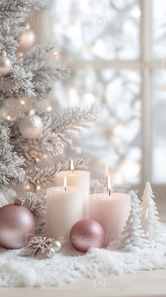 Белый рождественский фон с украшениями, снежинками, свечами, украшениями и размытым деревом на заднем плане