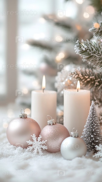 Белый рождественский фон с украшениями, снежинками, свечами, украшениями и размытым деревом на заднем плане