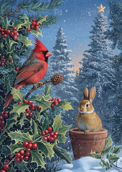 Очаровательная зимняя сцена, прекрасно демонстрирующая ярких кардиналов, милого кролика и заснеженные сосновые ветви