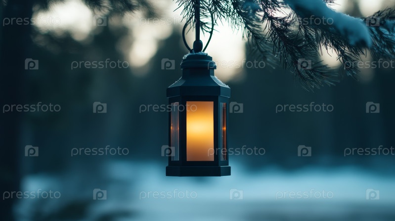 Уютный зимний фонарь, висящий в красивом снежном лесу, создает волшебную атмосферу