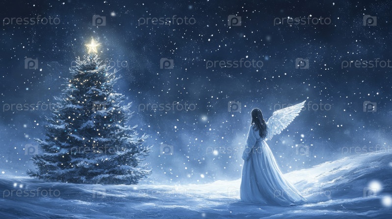 Очаровательный ангел изящно стоит у рождественской елки, установленной в волшебной сцене Зимней страны чудес