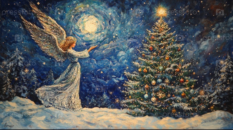Очаровательный ангел изящно стоит у рождественской елки, установленной в волшебной сцене Зимней страны чудес