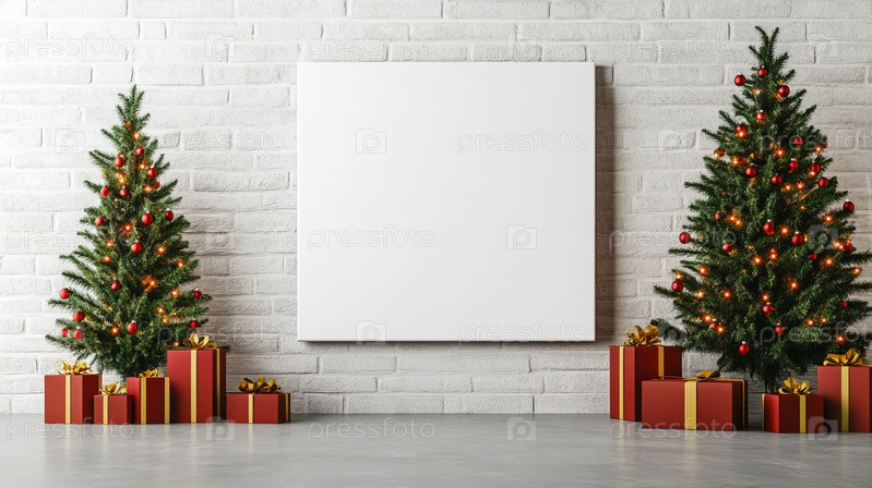 Красивая рождественская сцена с украшенным деревом рядом с пустым холстом, идеально подходит для праздничных дизайнов