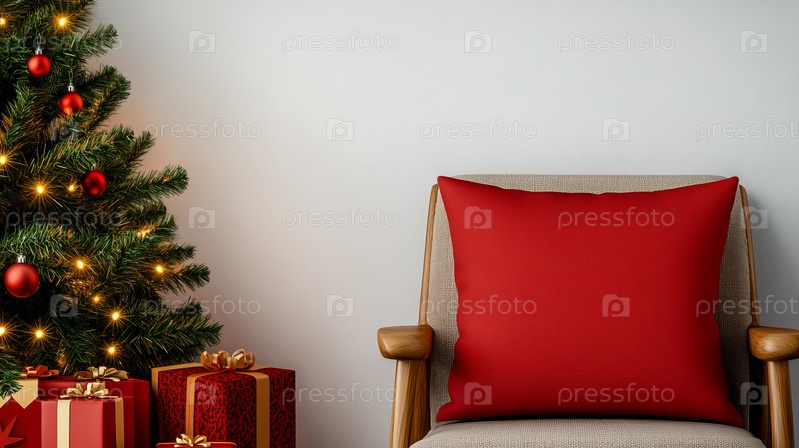 Красивая рождественская сцена с украшенным деревом рядом с пустым холстом, идеально подходит для праздничных дизайнов