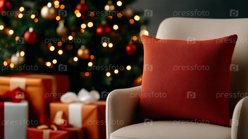Красивая рождественская сцена с украшенным деревом рядом с пустым холстом, идеально подходит для праздничных дизайнов