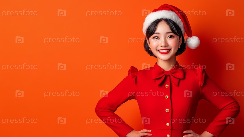 Веселая молодая женщина в праздничной шляпе Санта радостно празднует Рождество в ярком красном наряде