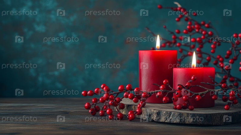 Элегантное и красивое расположение красных свечей в окружении различных ягод, идеально подходит для вашего праздничного декора