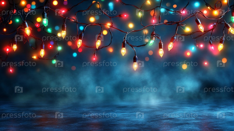 Струнные огни на темно-синем фоне. Декоративная гирлянда для торжеств, свадеб или партийных украшений с теплыми, светящимися луковицами. Реалистичные феи легкой цепи