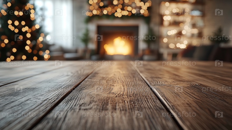 Пустая деревянная столешница с размытой рождественской елкой и камином на заднем плане