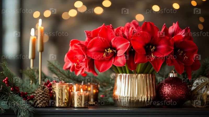 Потрясающие и яркие красные цветы вместе с мерцающими свечами работают вместе, чтобы создать уютную атмосферу праздника