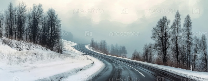 Абсолютно завораживающий воздушный захват извилистой дороги, протекающей через снежный лесной ландшафт
